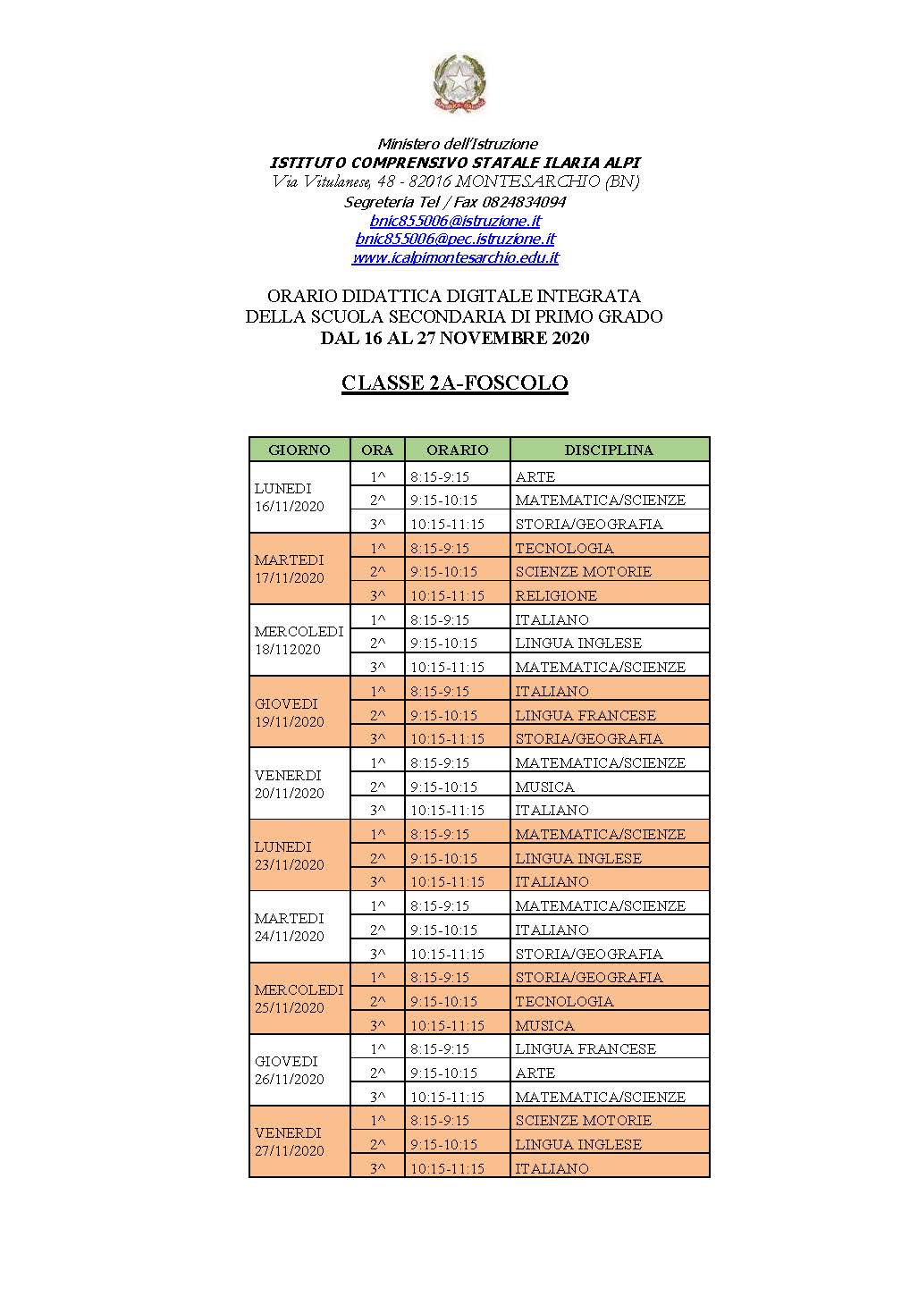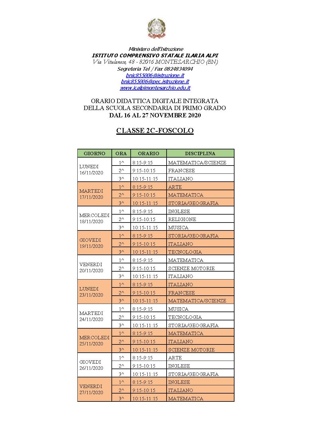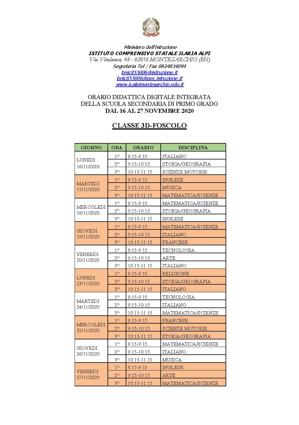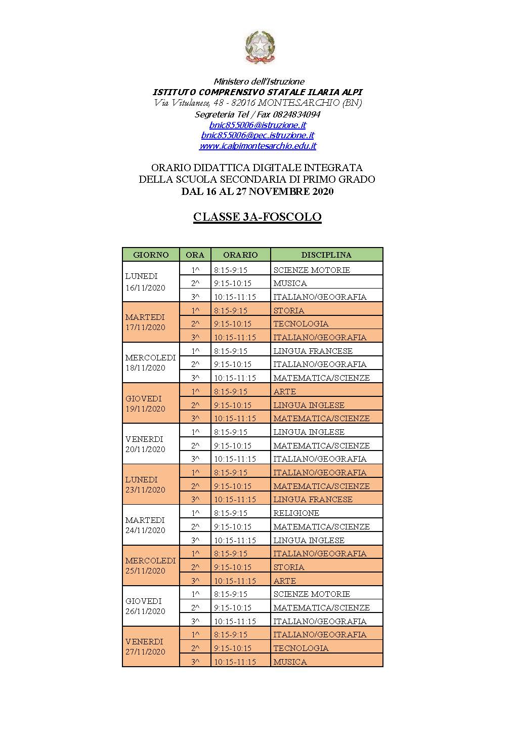 ORARIO DELLE LEZIONI SCUOLA SECONDARIA DAL 16 AL 27 NOVEMBRE 2020