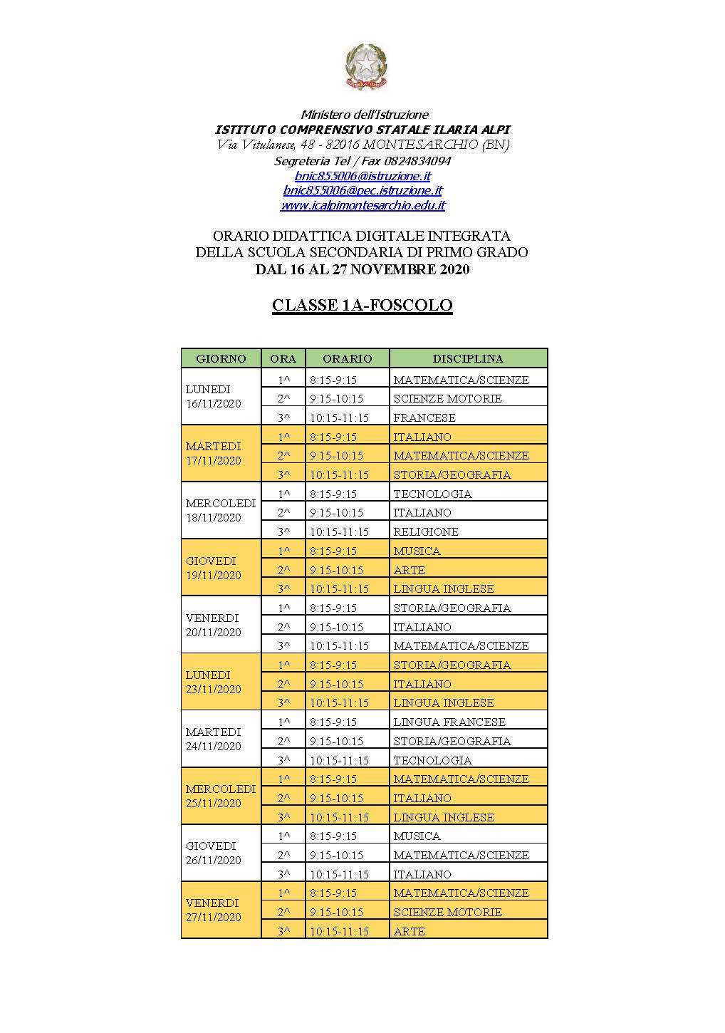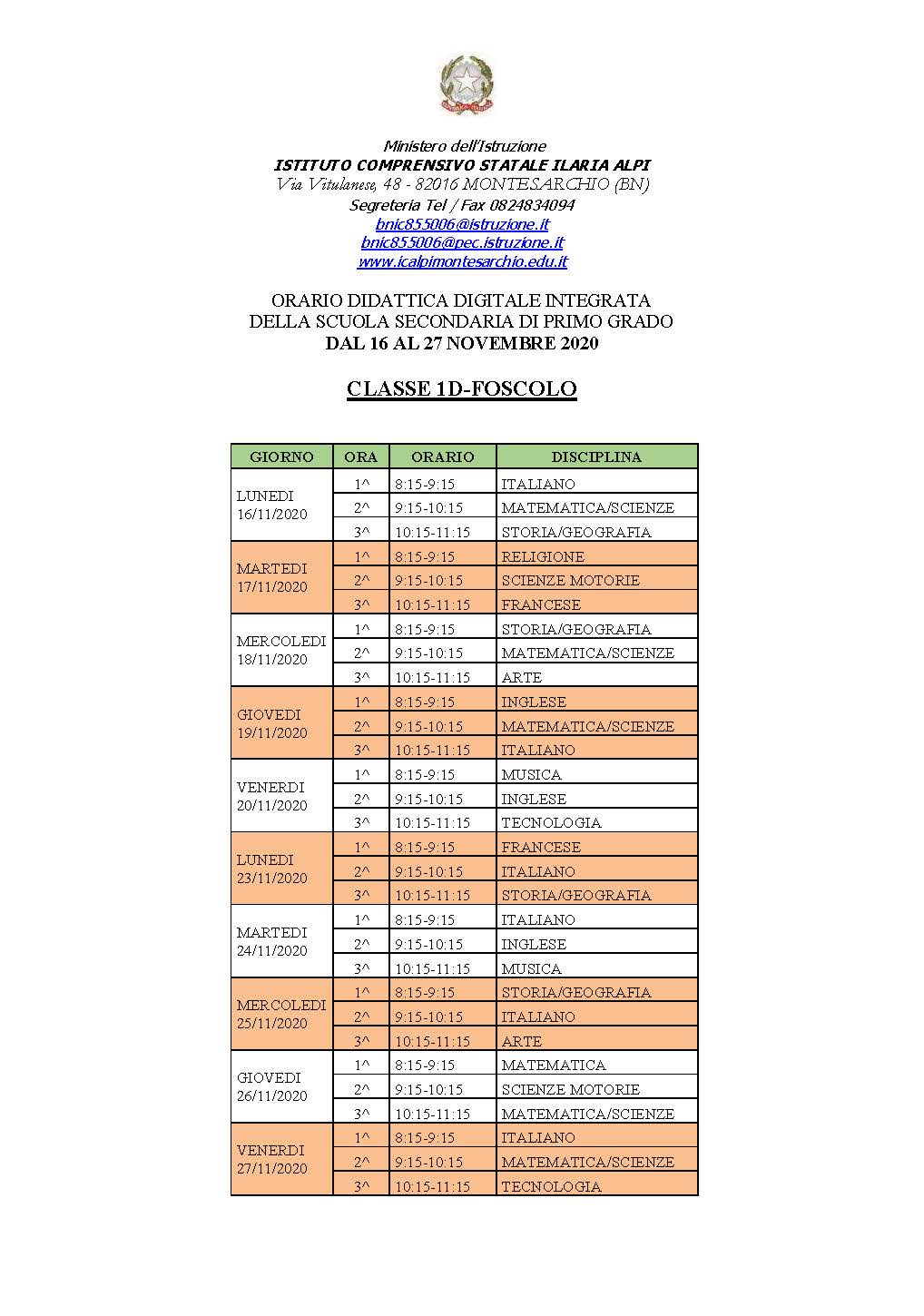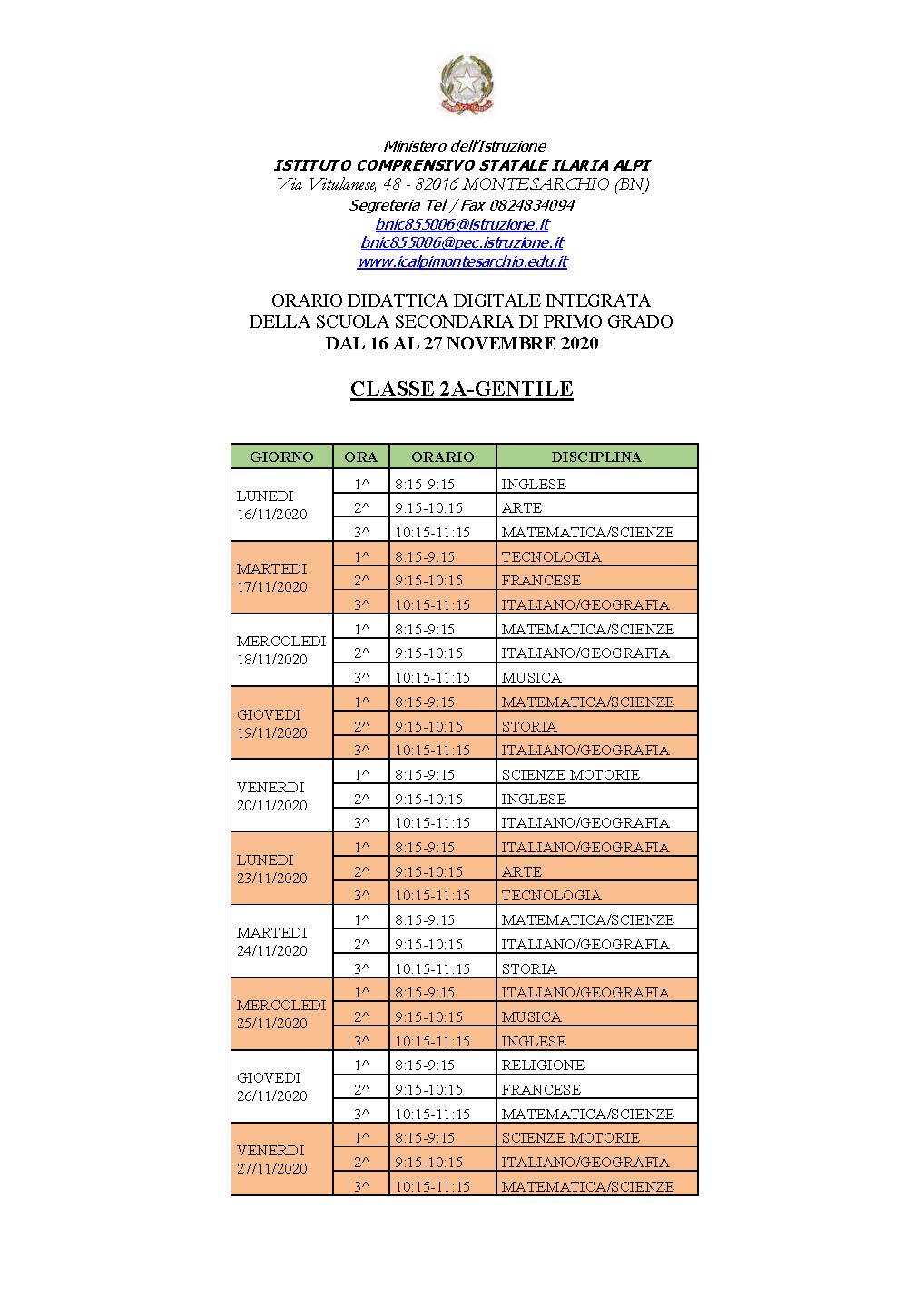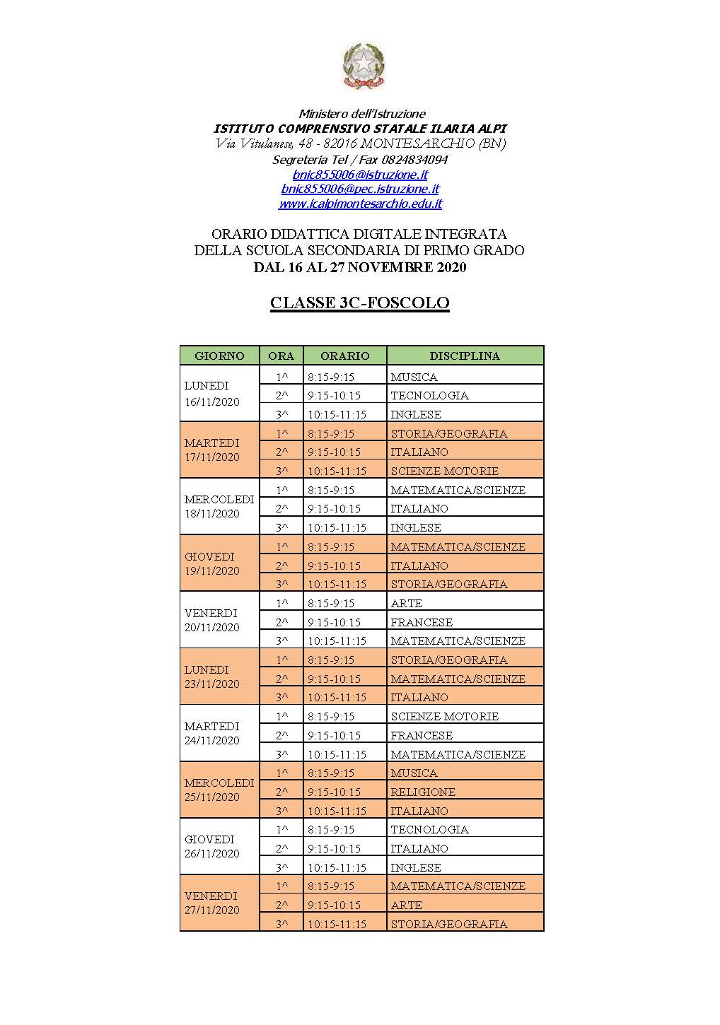 ORARIO DELLE LEZIONI SCUOLA SECONDARIA DAL 16 AL 27 NOVEMBRE 2020