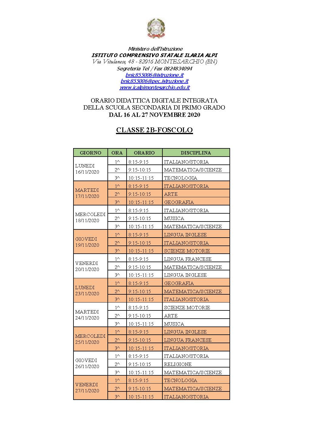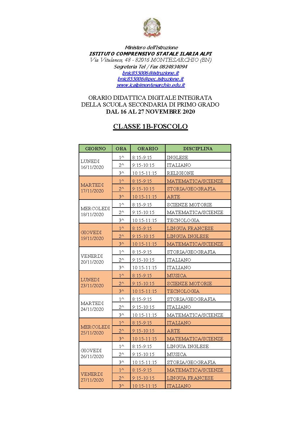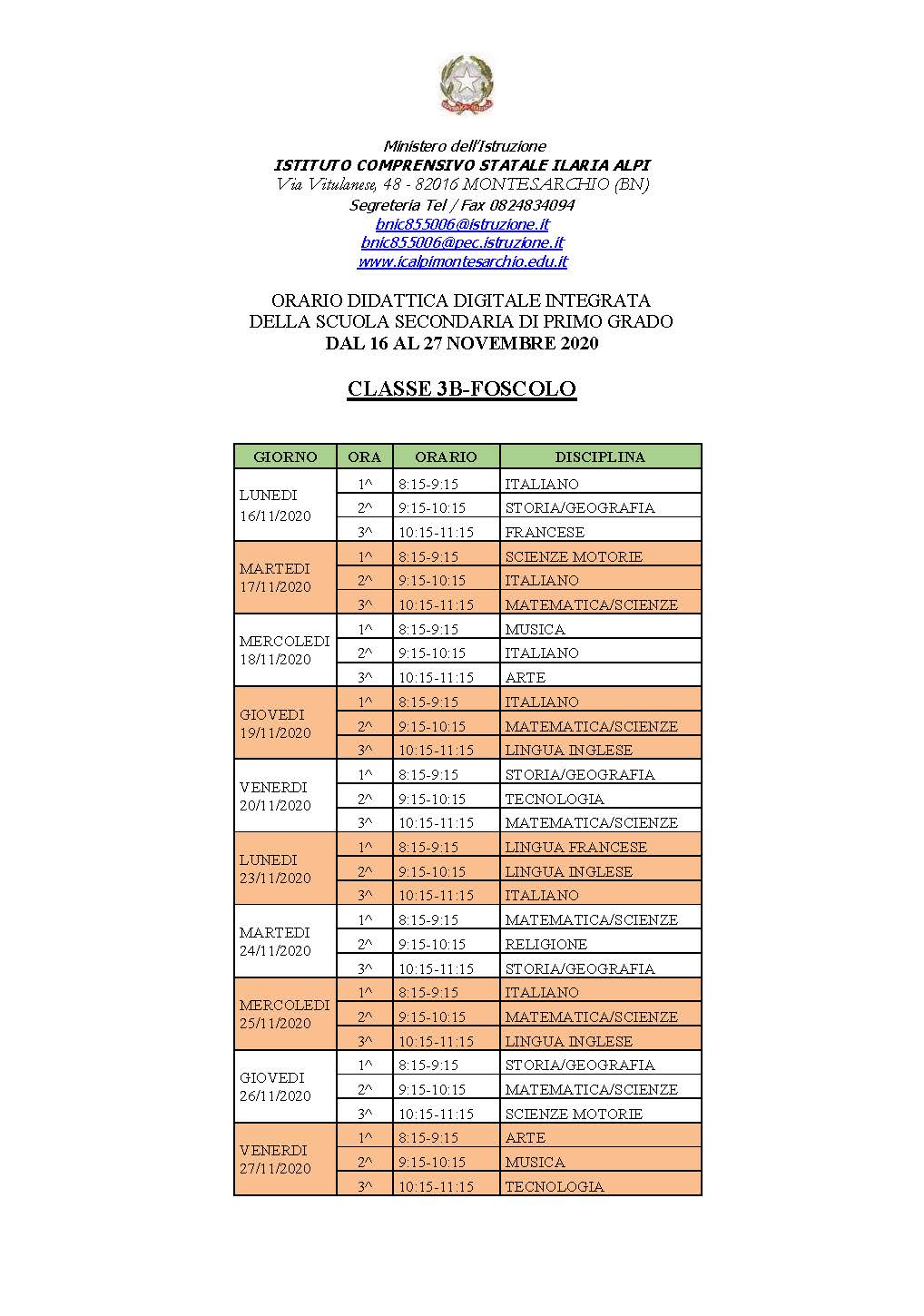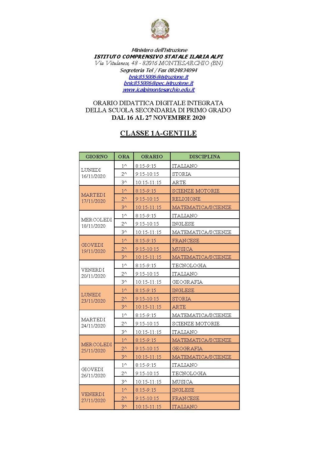 ORARIO DELLE LEZIONI SCUOLA SECONDARIA DAL 16 AL 27 NOVEMBRE 2020