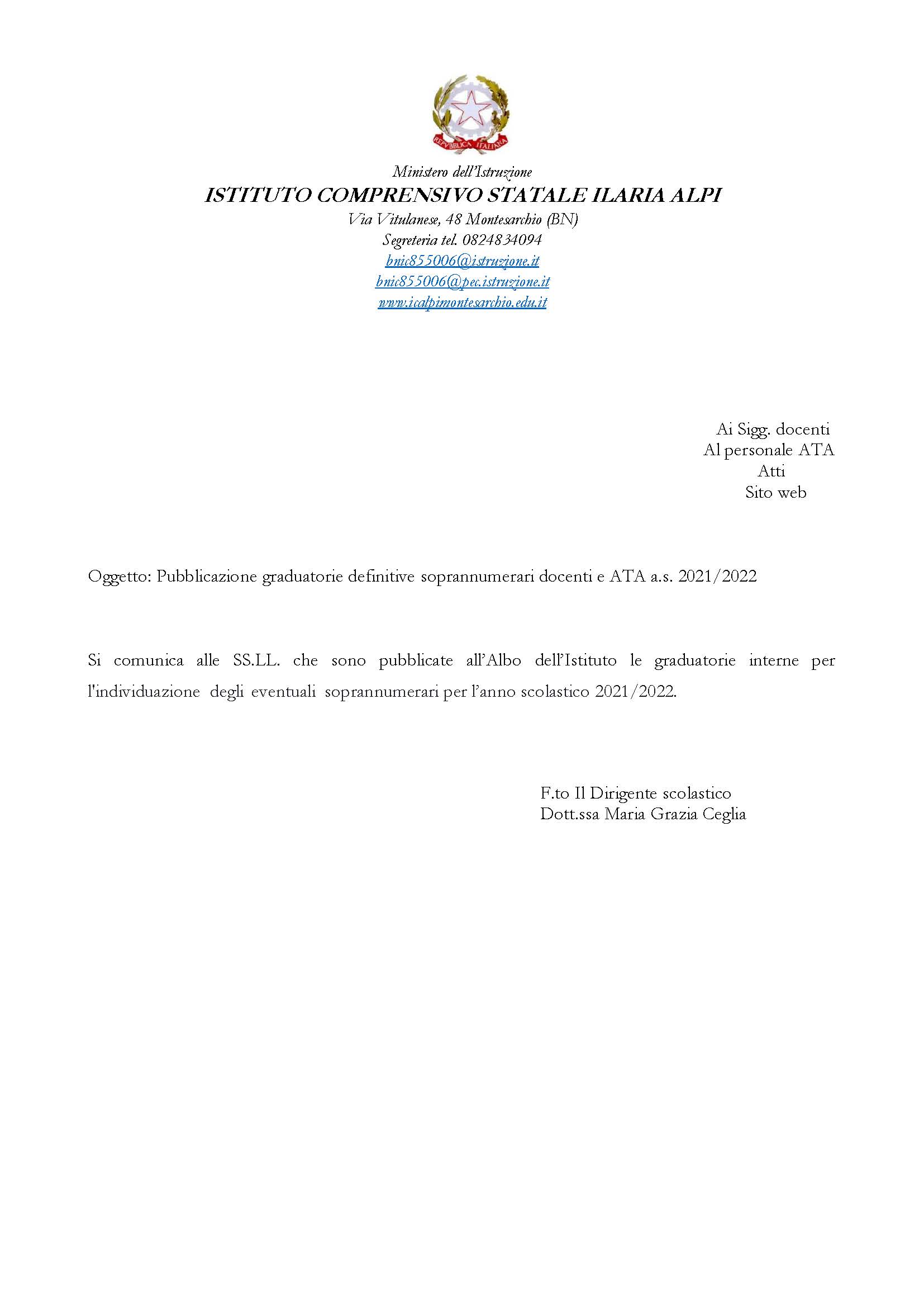 Pubblicazione graduatorie definitive soprannumerari docenti e ATA a.s. 2021-2022