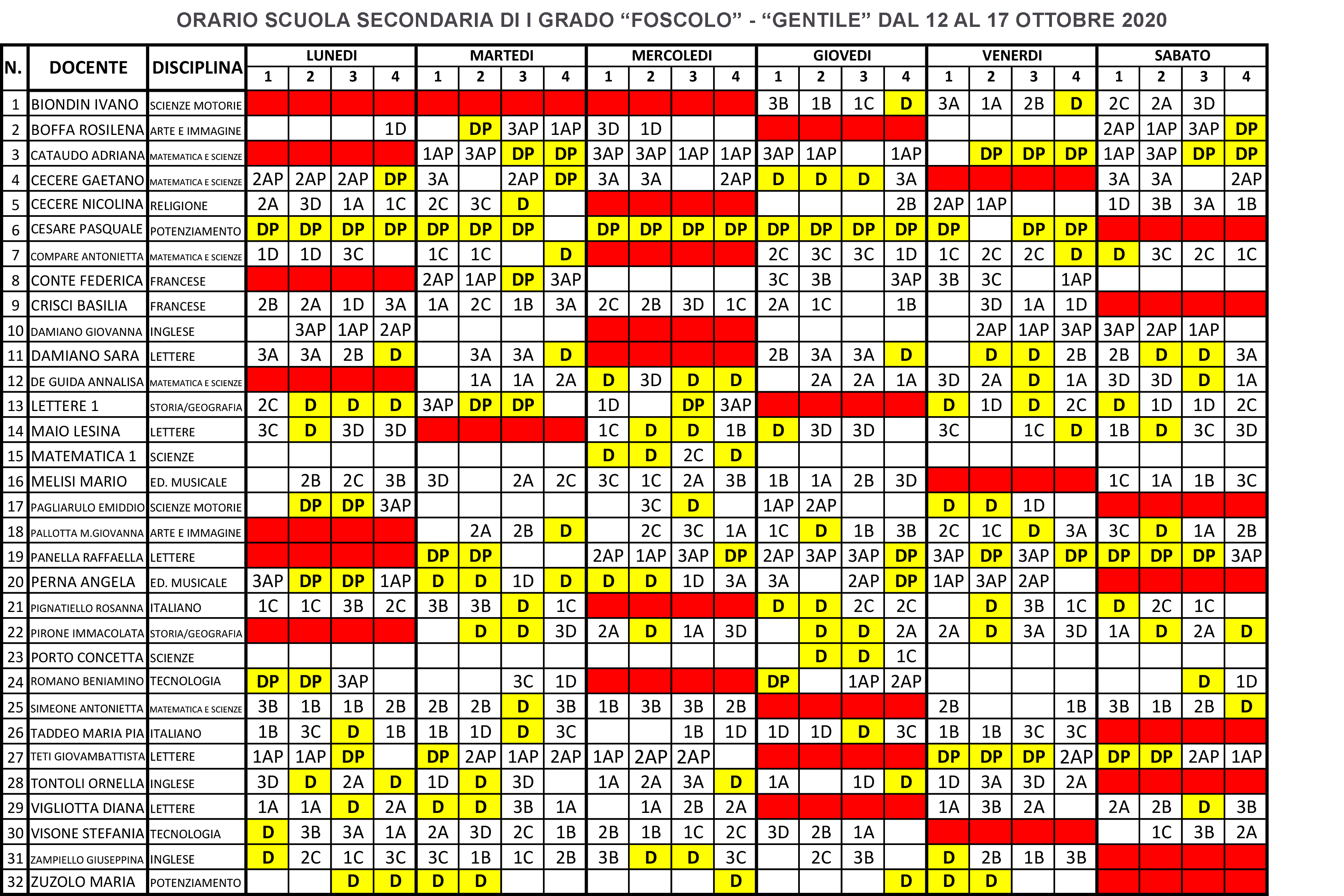 ORARIO secondaria di I grado " Gentile" Pannarano -" Foscolo" Montesarchio dal 12 al 17 ottobre
