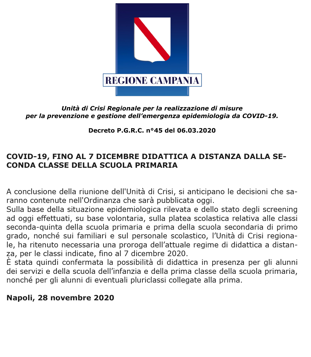 COVID-19, FINO AL 7 DICEMBRE DIDATTICA A DISTANZA DALLA SECONDA CLASSE DELLA SCUOLA PRIMARIA
