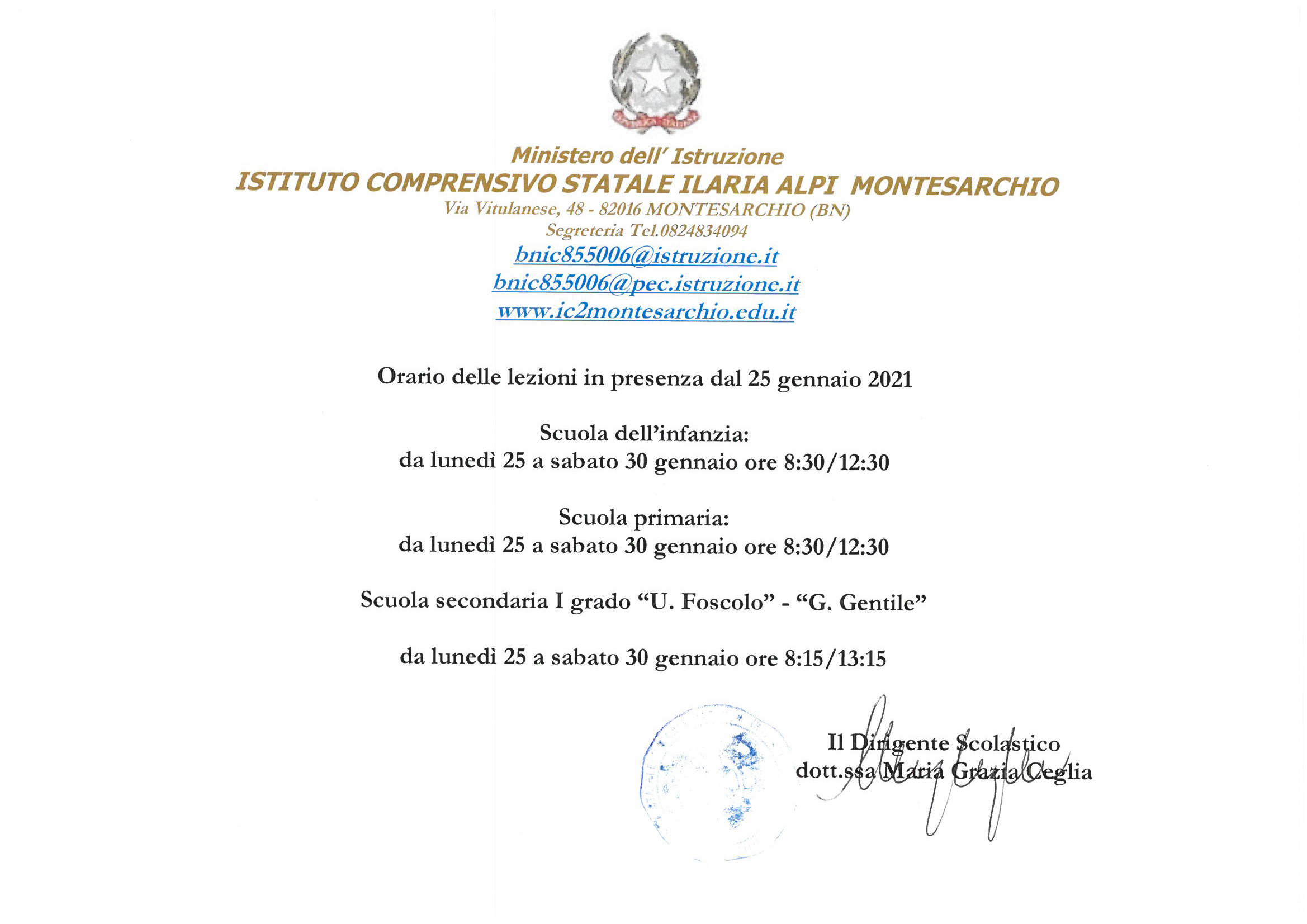 Orario delle lezioni in presenza