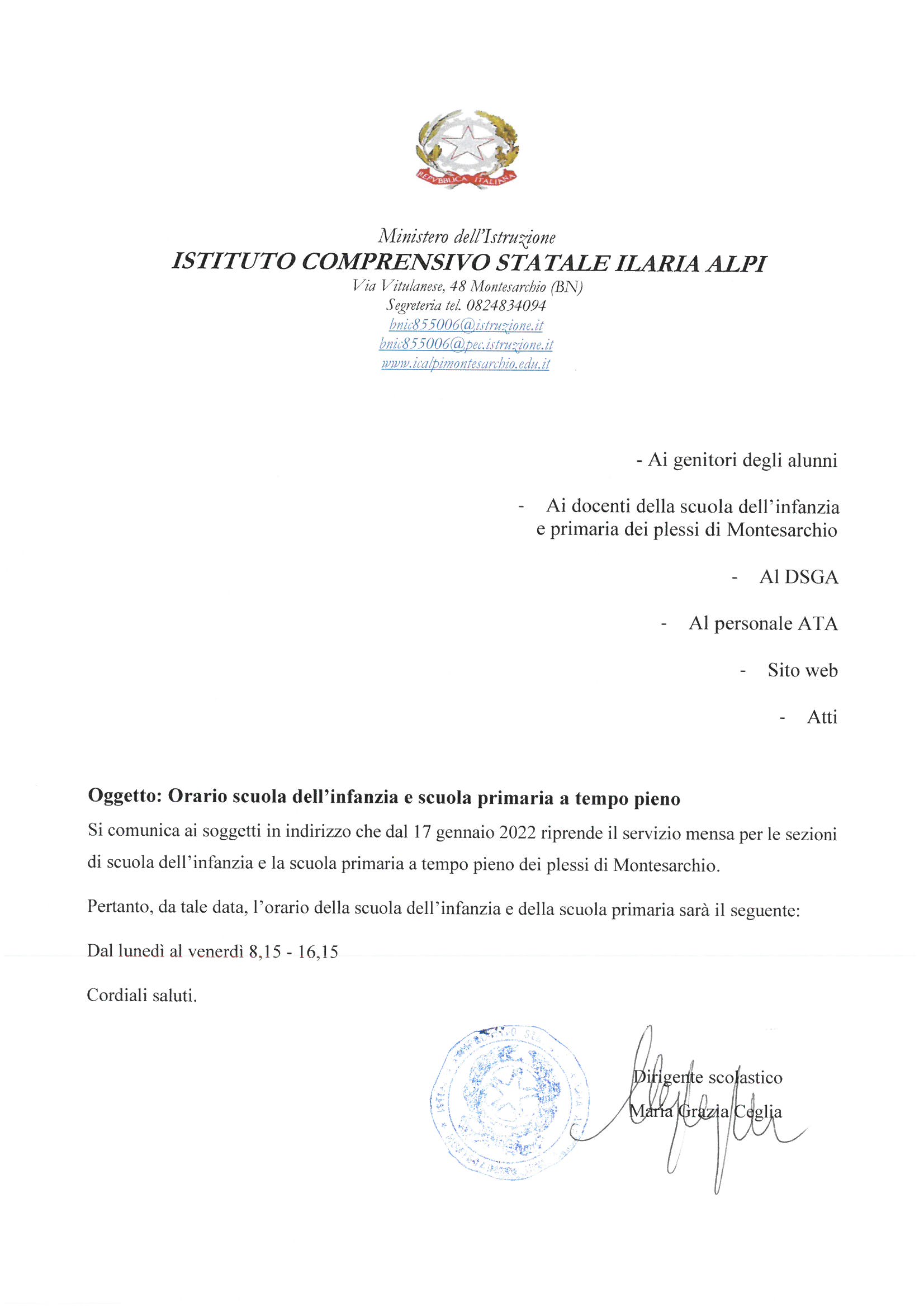 Orario scuola infanzia e primaria a tempo pieno