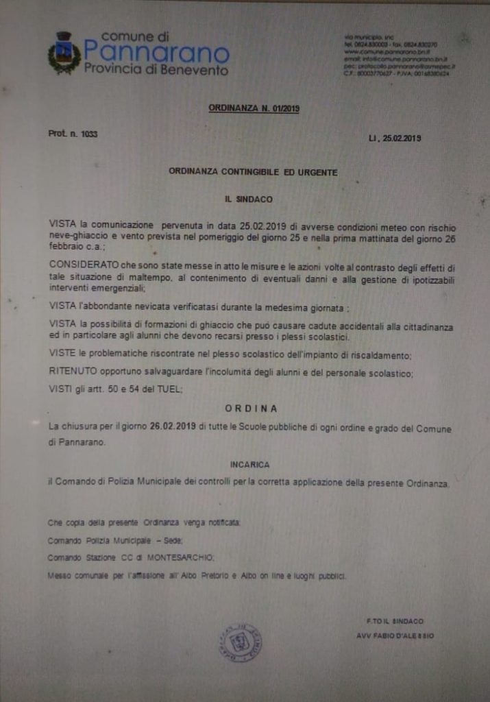 Ordinanza di chiusura Comune di Pannarano per il giorno 26 febbraio 2019