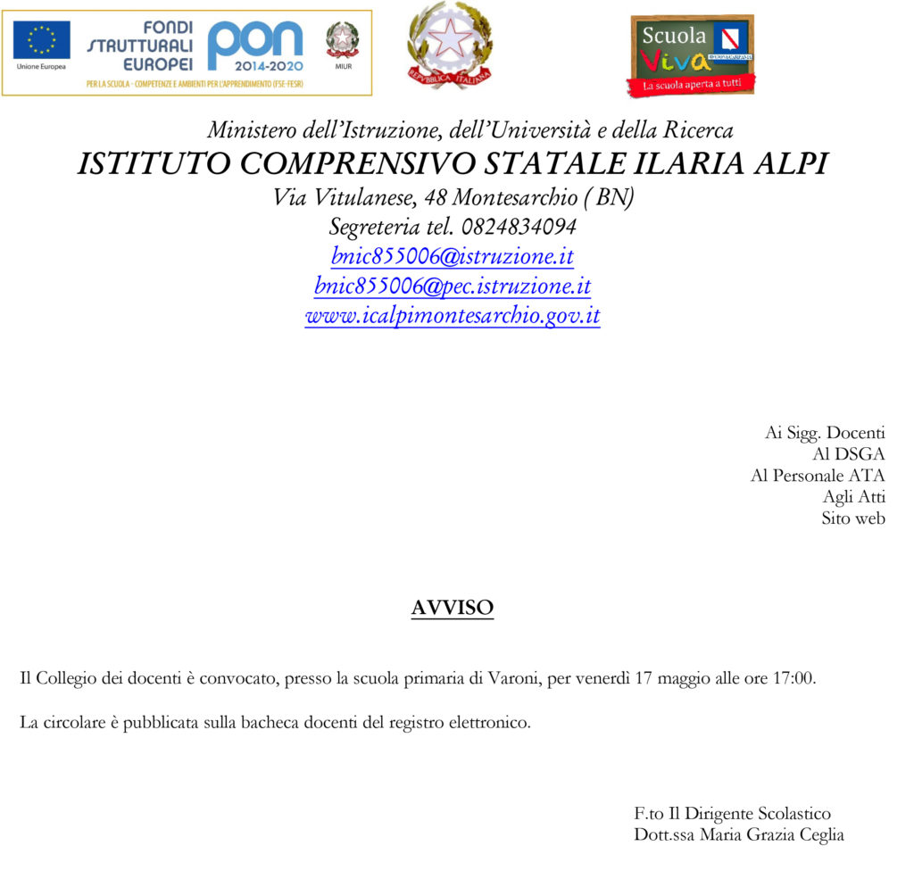 Avviso Collegio dei docenti 14 Maggio 2019 - 9:38 18 Maggio 2019Circolari, Comunicazioni, News ATA, News Docenti