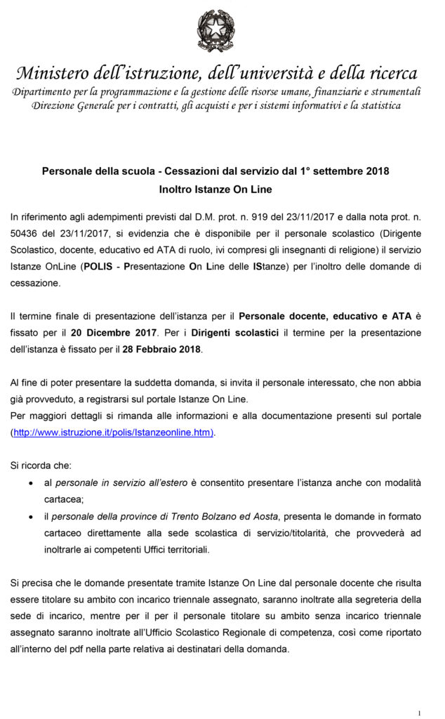 CESSAZIONE DAL SERVIZIO DAL 1° SETTEMBRE 2018