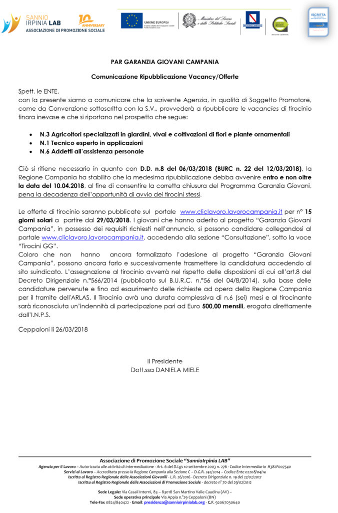 Home Amministrazione Trasparente PAR GARANZIA GIOVANI CAMPANIA Comunicazione Ripubblicazione Vacancy/Offerte