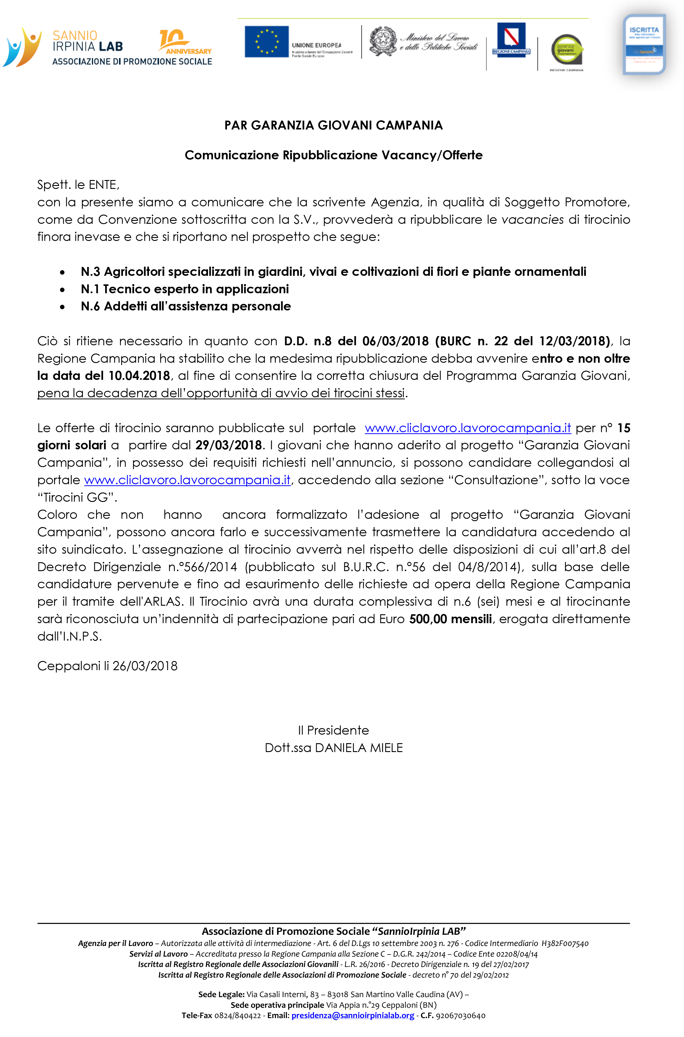 PAR GARANZIA GIOVANI CAMPANIA Comunicazione Ripubblicazione Vacancy/Offerte